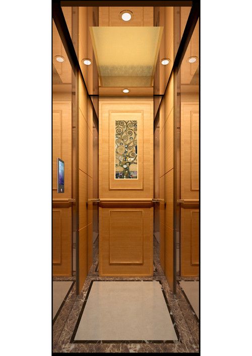轎廂款型:富麗華庭  天井ECO-FL,鏡面不銹鋼(鍍玫瑰金)+金箔貼面  前側板鏡面不銹鋼(鍍玫瑰金)  門楣鏡面不銹鋼(鍍玫瑰金)  兩側木飾面+鏡面不銹鋼(鍍玫瑰金)  后側板木飾面+鏡面不銹鋼(鍍玫瑰金)+裝飾畫(選配)  轎門鏡面不銹鋼(鍍玫瑰金)  操作盤BC-T8A1  扶手實木+發紋不銹鋼  地板大理石拼花(西班牙米黃+金鑲玉+水晶啡)