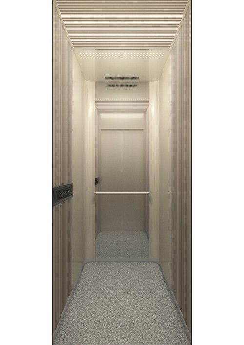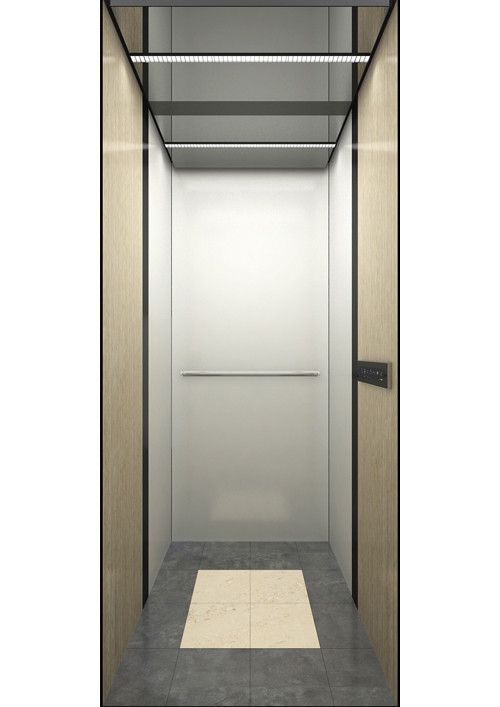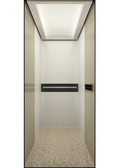 轎廂型號:YG-1622  天井:白色砂紋噴漆板(YG-05)+鏡面不銹鋼  兩側、后側板:兩側香檳色砂紋鋼板(YG-07),后側香檳色砂紋鋼板(YG-07)+深咖色砂紋烤漆板(YG-08)+鏡面飾條  前側板、門楣:緞紋不銹鋼  轎門:緞紋不銹鋼  地板:FL-P34(米黃PVC)  操作盤:BD-D2F1